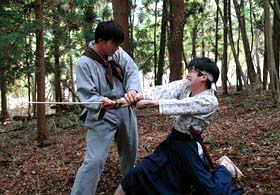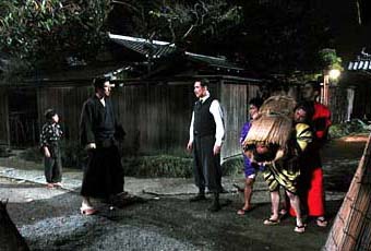 義龍と健太は町に着き、花をさらった男たちを見つけ賭博場へとたどり着く。そんな2人に気づき、次々と殴りかかってくるヤクザたち。しかし、ここでも義龍は一切手を出さず払いだけで凌ぐが、健太を人質として捕えられてしまう。抵抗せず殴られるがままの義龍の横から、一瞬の隙を見て逃げ出した健太は、芸者・千代(吉野公佳)に助けを求める。 |